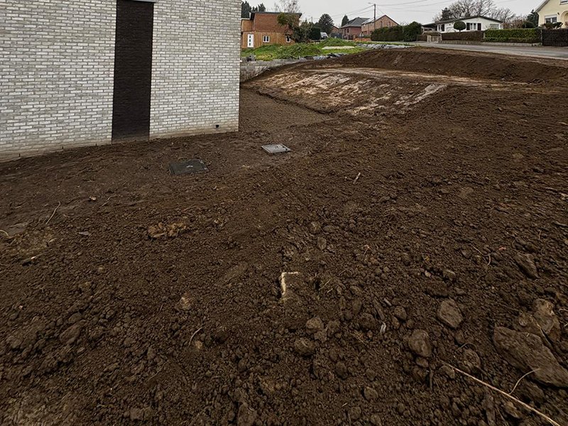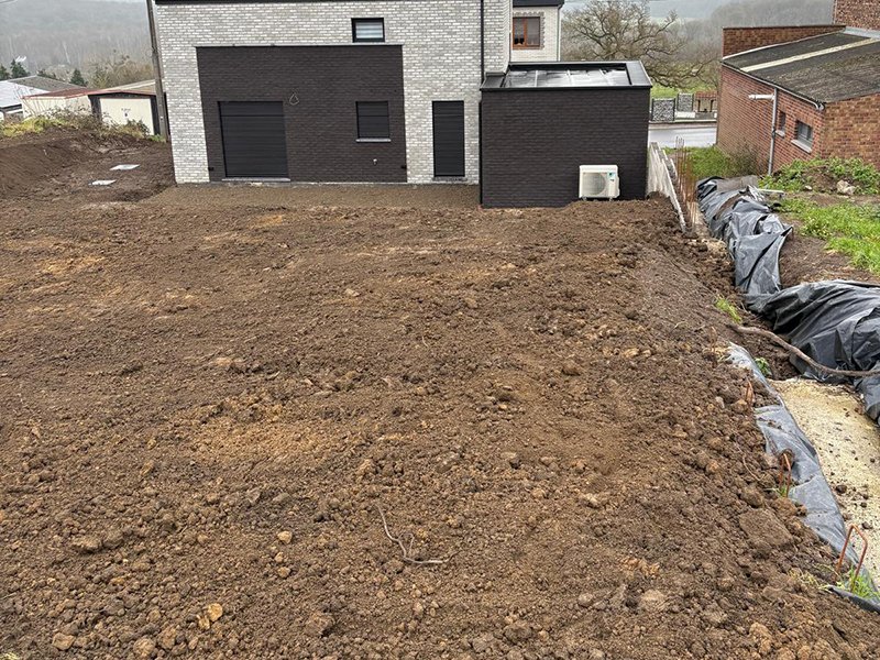 Décaissement complet de la zone, nivellement du sol et reprofilage du terrain afin de créer une surface plane et stable. Des talus ont été façonnés pour rattraper les différences de niveaux et sécuriser les abords, avec préparation du terrain en vue d’un futur aménagement (pelouse, terrasse, construction ou autre usage extérieur).